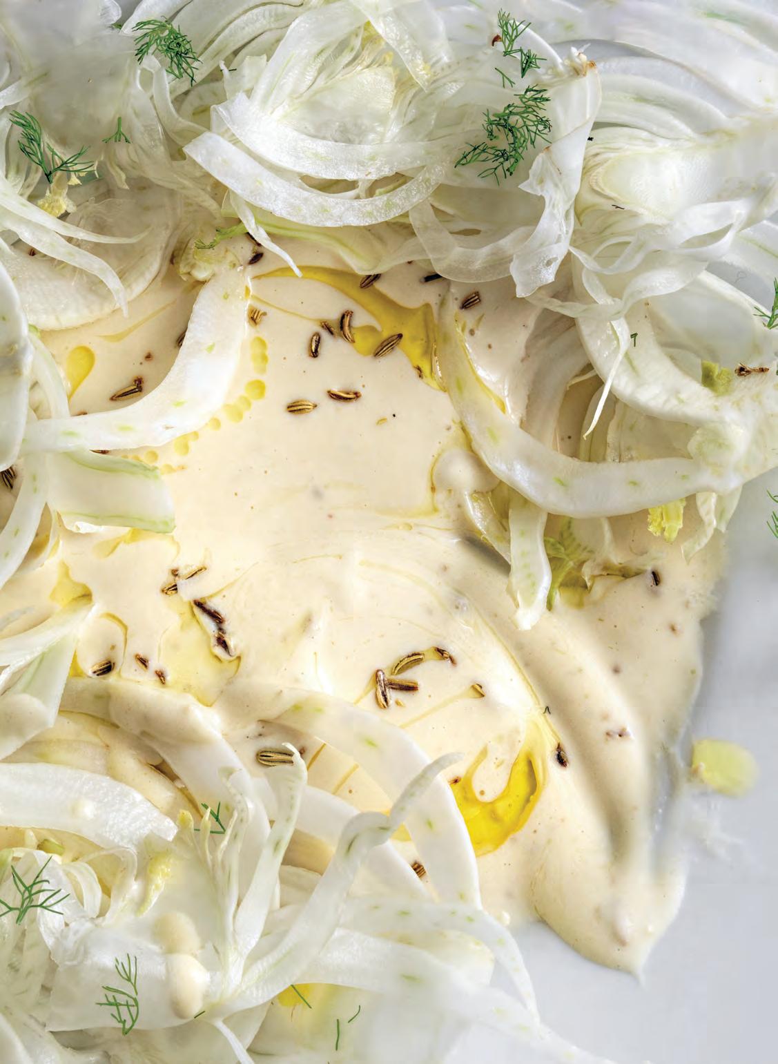 4. Lägg upp på en tallrik och droppa över olivolja. Lyft upp fänkålen ur vattnet, torka av noga och servera den till hummusen.