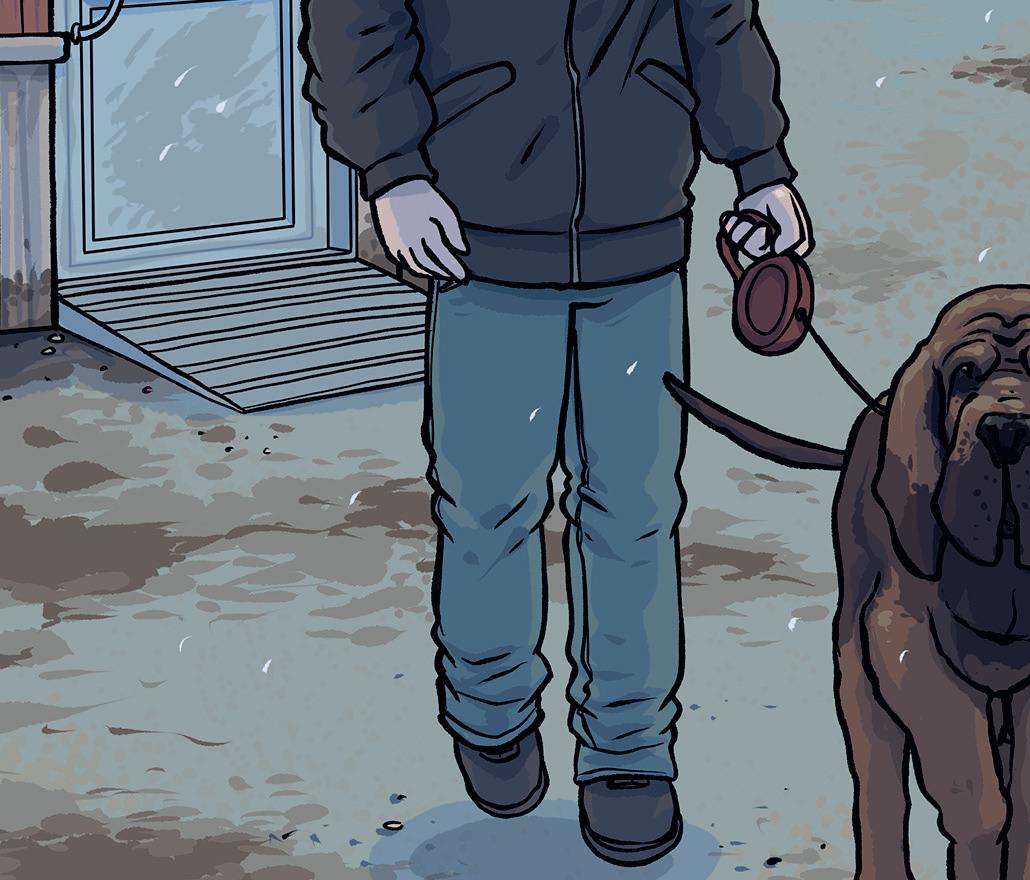 I samma stund kommer ett stycke päls farande mot mig. Pälsen tillhör Tubbe, som är Guns och Åkes blodhund. Tubbe tumlar runt framför mig, svansen piskar fram och tillbaka samtidigt som han nafsar på mina fi ngrar.
