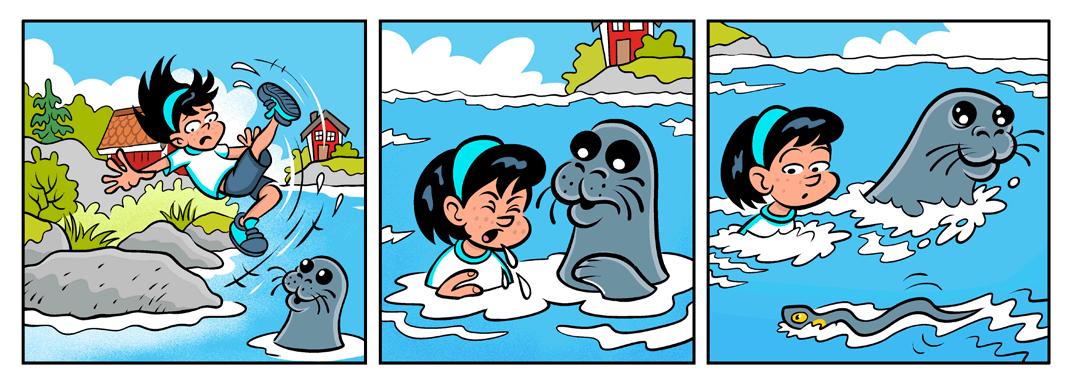 Sälen ser Cleo. Sälen och Cleo simmar.