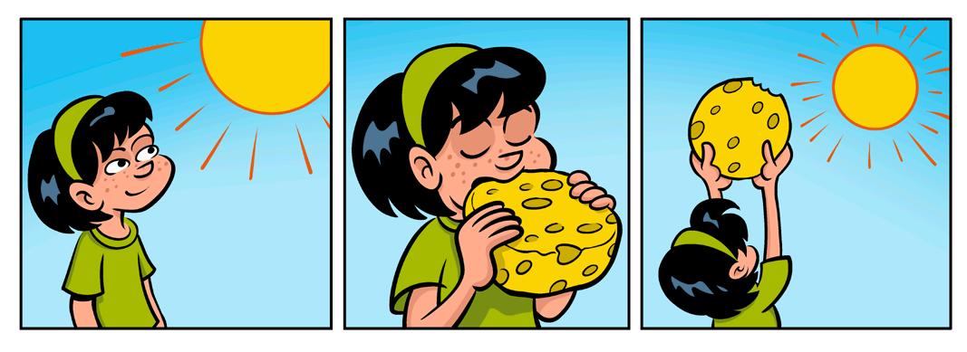 Cleo ser en sol. Cleo äter en ost. Osten är gul som en sol!