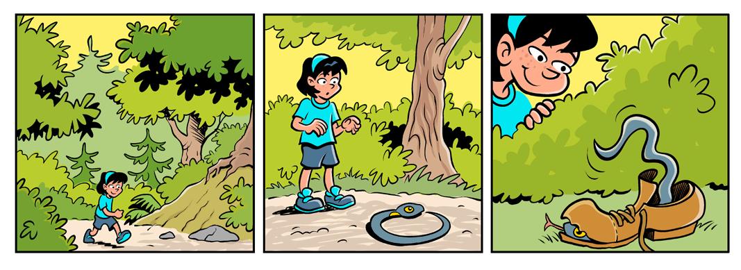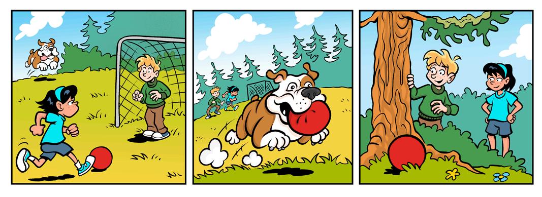 Cleo och Leo letar. Bollen ligger bakom en tall.