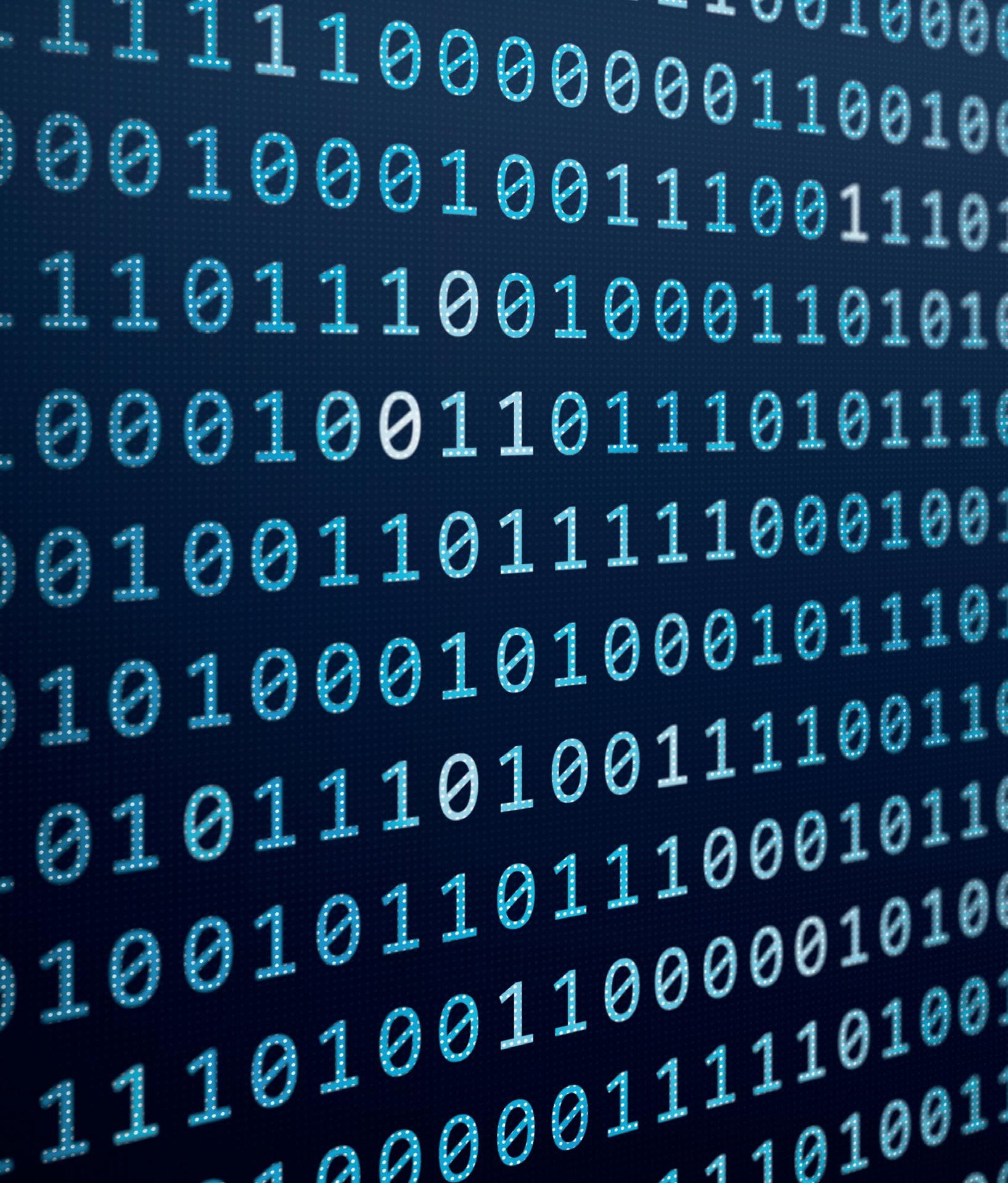 Bilden visar tre bokstäver skrivna med maskinkod. Påminn eleverna om att de under förra lektionen lärde sig att räkna som en dator. I dag ska de lära sig att läsa och skriva som en dator, med hjälp av maskinkod.