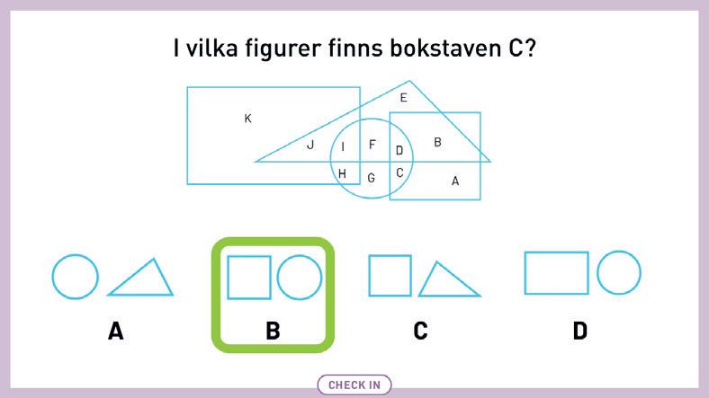 Check in är det första bildspelet i varje kapitel och motsvarande uppgifter ligger även först i varje kapitel i elevboken. Tanken är att eleverna ska få pröva och reflektera över olika uppgifter som de kommer att möta i kapitlet. Samtidigt som du klickar fram en uppgift i taget i bildspelet, så testar eleverna att svara i lektionsboken. De gör även individuella skattningar av uppgifterna på en skala från ”aldrig sett” till ”löser lätt” .