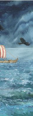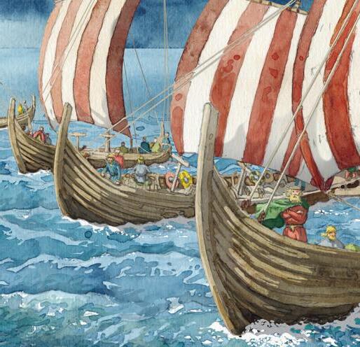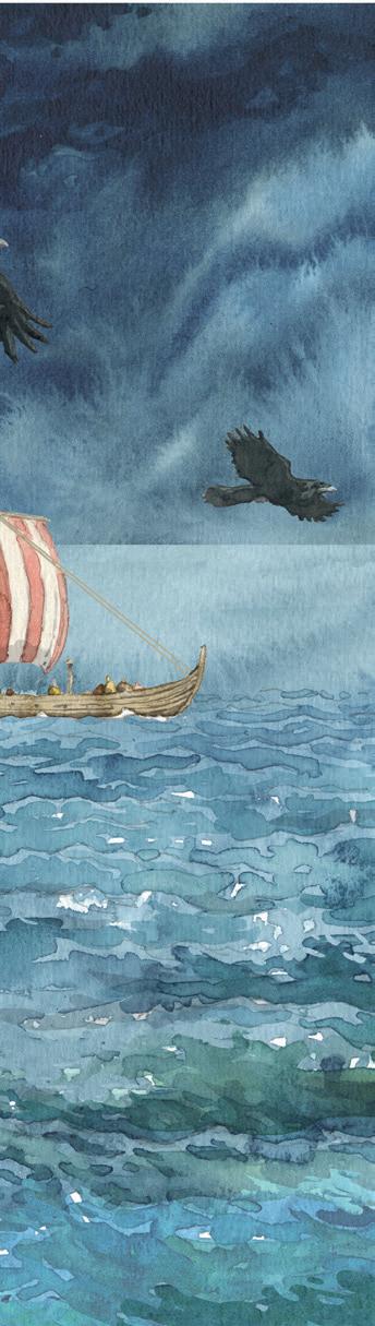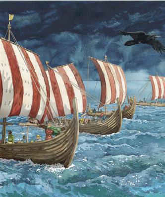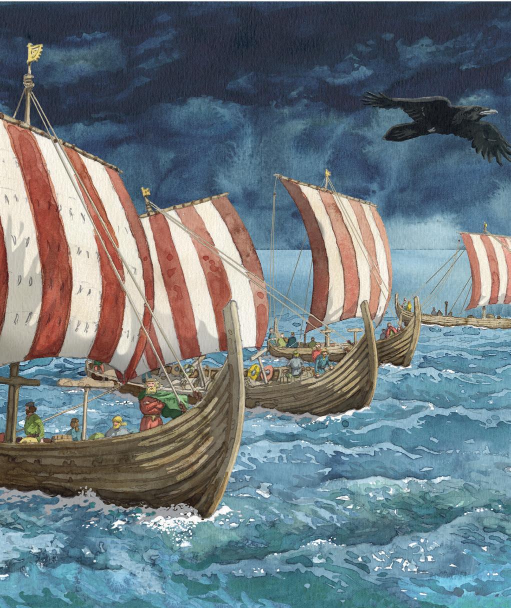 Kapitlets inledningsbild Bilden föreställer fyra vikingaskepp med vind seglen på öppet hav. denna skeppstyp kallades snäcka. Snäckan var en mindre typ av skepp jämfört med de mer kända långskeppen. Snäckan var bredare och kunde användas både för handel och i strid. Vi vet inte vart dessa vikingar är på väg men vi kan tänka oss att de har krigsguden Oden med sig då två korpar flyger framför skeppen. korpen var ett mytomspunnet djur och Odens korpar var allvetande. de flög över världen och förmedlade sin kunskap till Oden. Vikingar kunde ta med sig fåglar på långa seglatser på öppet hav för att släppa ut dem när de ville veta om de började närma sig land. Om det var långt till land kom fåglarna tillbaka till skeppet, annars stannade de på land.