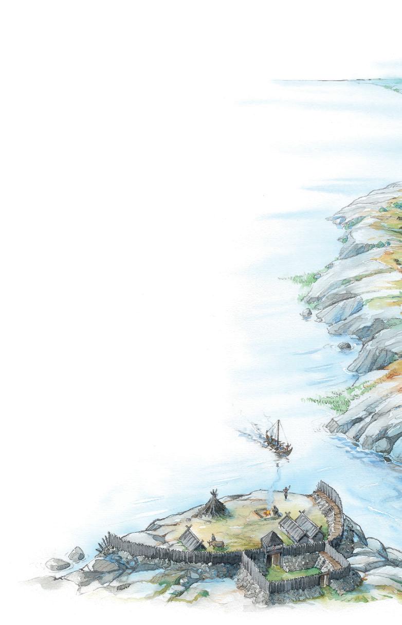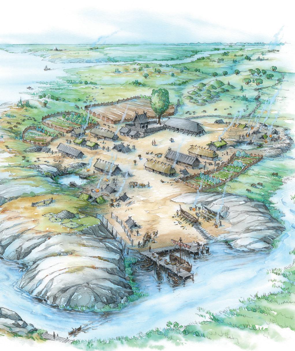 Så här kunde en by se ut på vikingatiden. Staket skyddar odlingarna från betande djur. Om fiender närmar sig på vattnet kan byborna ta skydd befästningen på höjden. De kan tända en stor eld för att varna folk inåt land.