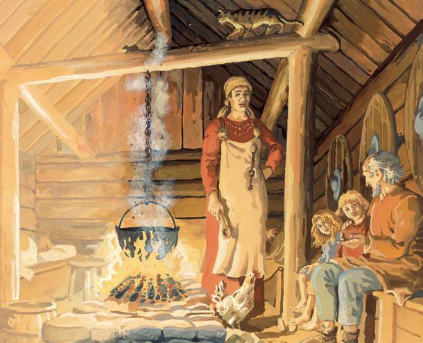 Livetibondbyn Undervikingatidenlevdeistortsettallapåbondgård. Påenbondgårdboddehusbonden,husfrunochderasbarn. Oftaboddeävennågraäldresläktingarpågården,kanske enfarmorochenmoster.Husbondenochhusfrun påansvaretförarbetetpågårdenochallasomboddedär hjälptetilliarbetet. Matochdryck Ienkedjapåhusfrunsdräkthängdenycklarnatillgårdens olikahusochförråd.Nycklarnavisadeattdetvarhonsom bestämdeövermaten.Matenundervikingatidenbestodav detsommänniskornakundefåfrångårdenochnaturen. Pååkrarnaodladeskorn,rågochhavre.Djurenpågården gavkött,mjölkochägg.Iskogenjagadeochplockademan bärochannatätbart.Tillmatendrackmanvattenelleröl. Iblanddrackmanävenmjöd,somärettslagsvin.
