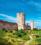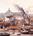 På höjden ligger en befästning med en vall av stora stenar och ett träplank.