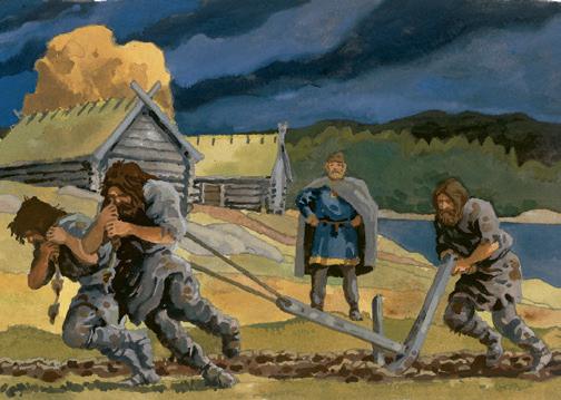 En husbonde ser på när hans trälar plöjer åkerjorden.