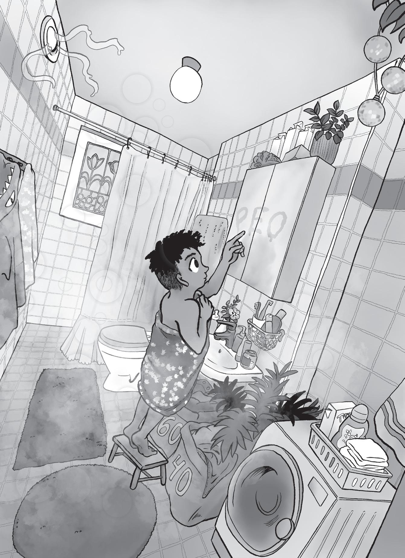 När han är klar är badrummet fullt av ånga. Peo tar handduken och torkar sig noga. Han drar fingret över spegeln.