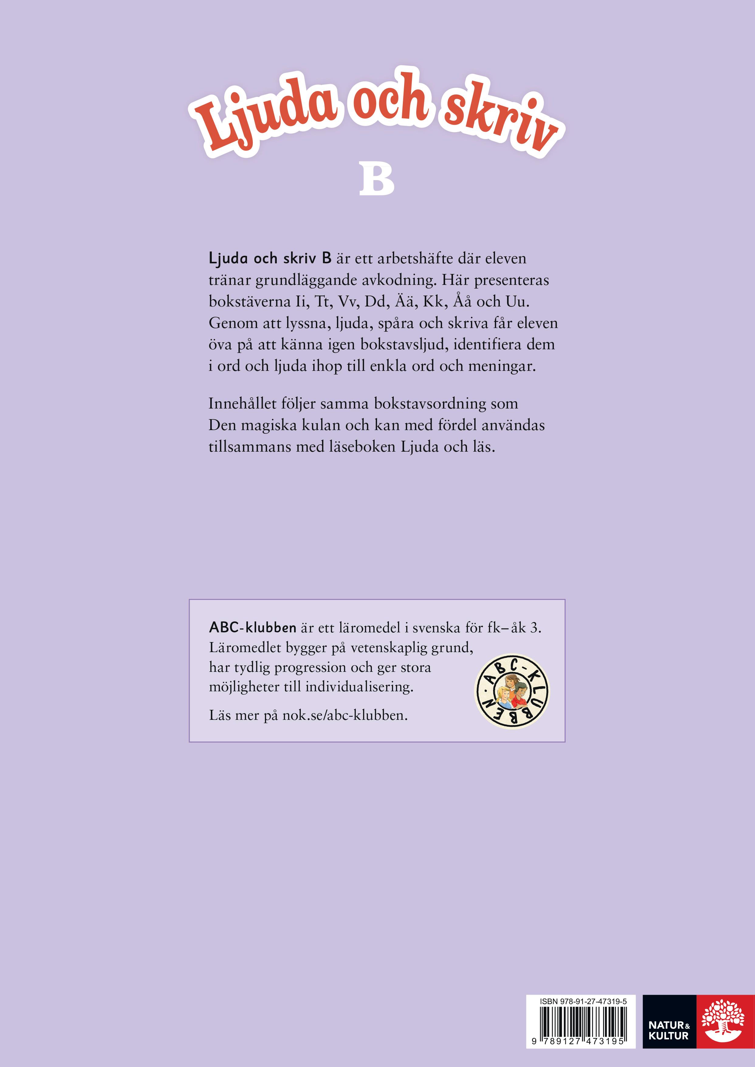 Det här är ett arbetshäfte där eleven tränar grundläggande avkodning och inkodning genom att lyssna, ljuda, spåra och skriva. Bokstäverna presenteras i samma ordning som i Den magiska kulan, och häftet kan med fördel användas tillsammans med läseboken Ljuda och läs.
