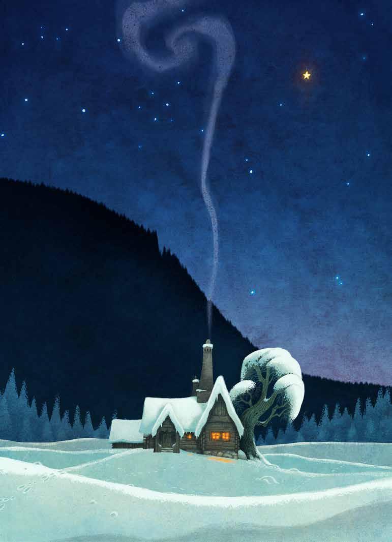 På natten kröp syskonen ihop som hundvalpar. Stina försökte tänka på juleljus och god mat. Men det enda hon kunde se framför sig var den hjärtlöse trollkarlen i sin korpsvarta borg, och den isblå röken som var hans onda magi. Fanns den utanför stugan nu?