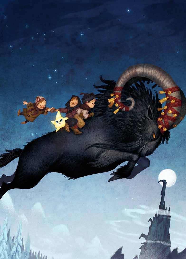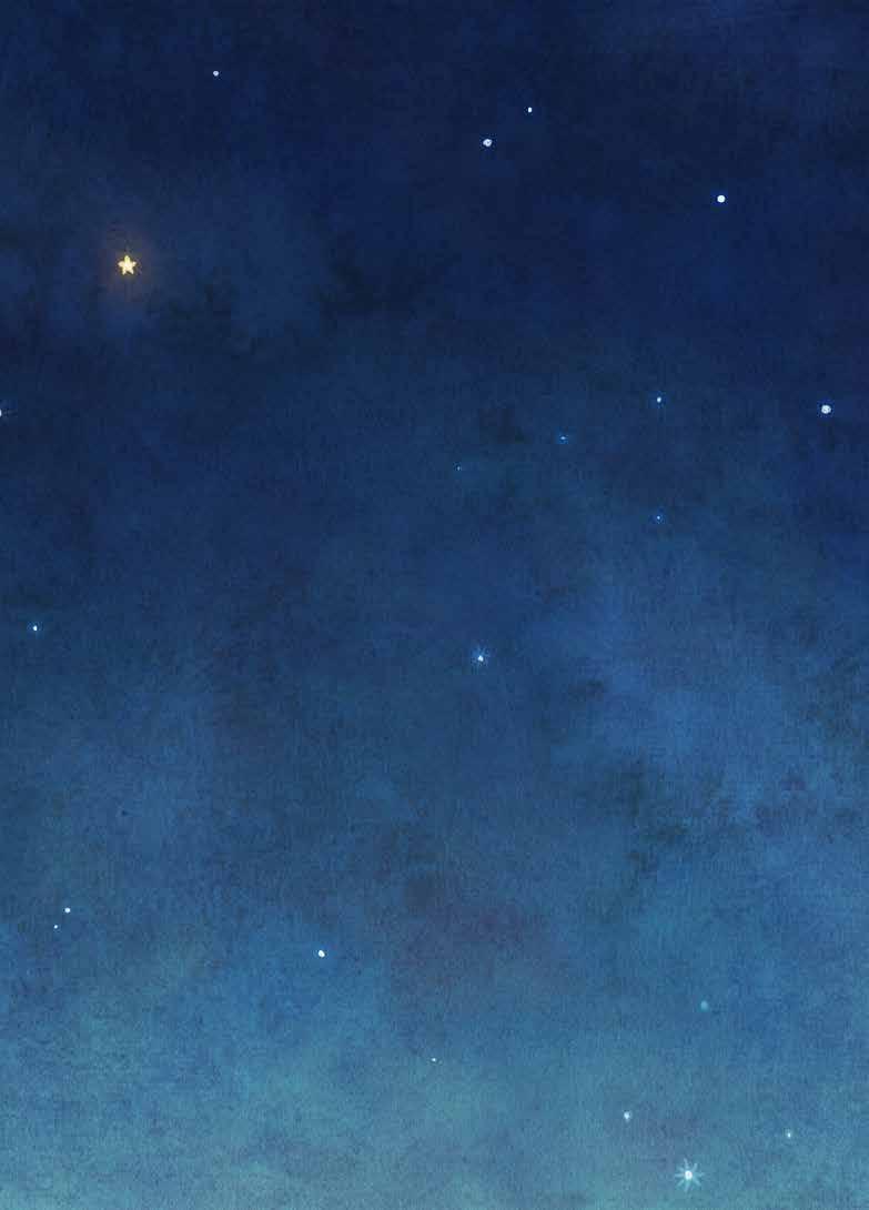 Högt upp på himlavalvet hängde stjärnorna och kikade in genom fönstret. De såg på de tre slumrande syskonen som inte hade någon aning om vilket väldigt äventyr som väntade dem.
