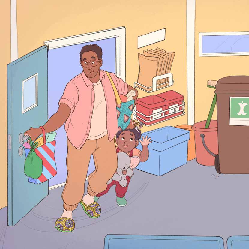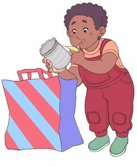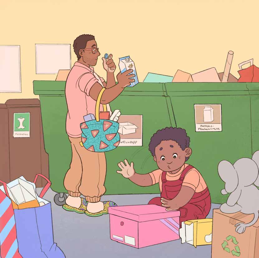 Att återvinna blir lek och språkstimulans när barnet får hjälpa till hos både mamma och pappa. Berättelsen visar hur det ser ut när man återvinner på olika platser och var varje sak hör hemma.