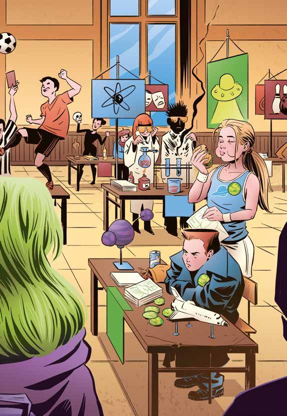 Man kunde välja mellan fotboll, basket, vetenskap, teater, UFO … UFO?! tänkte Andromeda och stannade till. Det var det dummaste. Hon betraktade UFO-klubbens bord. Där satt en sur kille i svart skinnrock. Han såg ut precis som Andromeda hade föreställt sig att någon som tror på UFO:n skulle se ut.