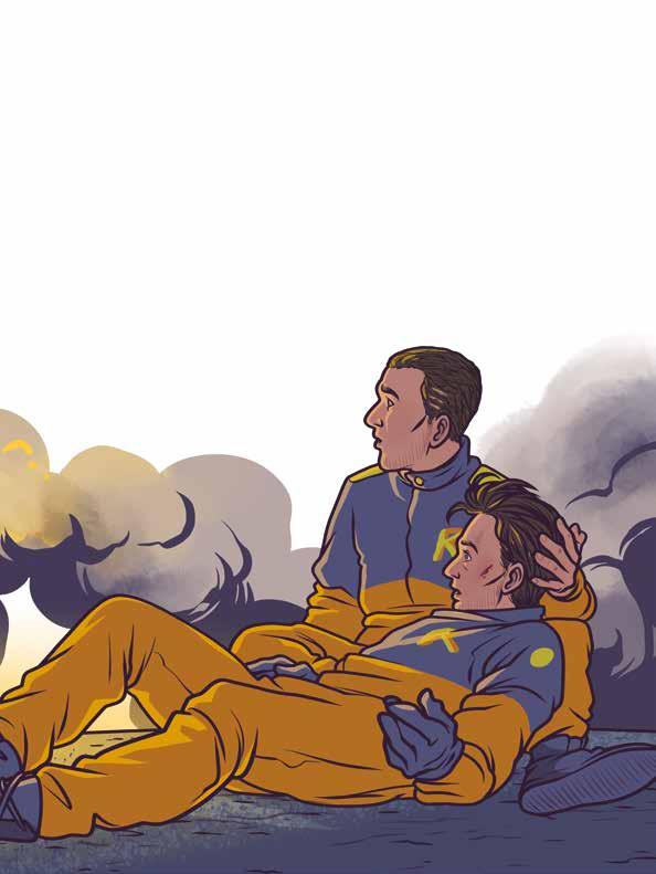 fort. Sandro hinner inte reagera förrän en stor tryckvåg kastar honom framåt och ner mot den hårda asfalten. En obeskrivlig hetta slår emot honom. För ett ögonblick försvinner alla ljud, det enda han hör
