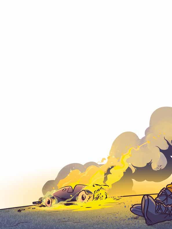 på banan brinner hans älskade bil i ett stort svart moln. Han stirrar på den flammande, hotfulla elden.