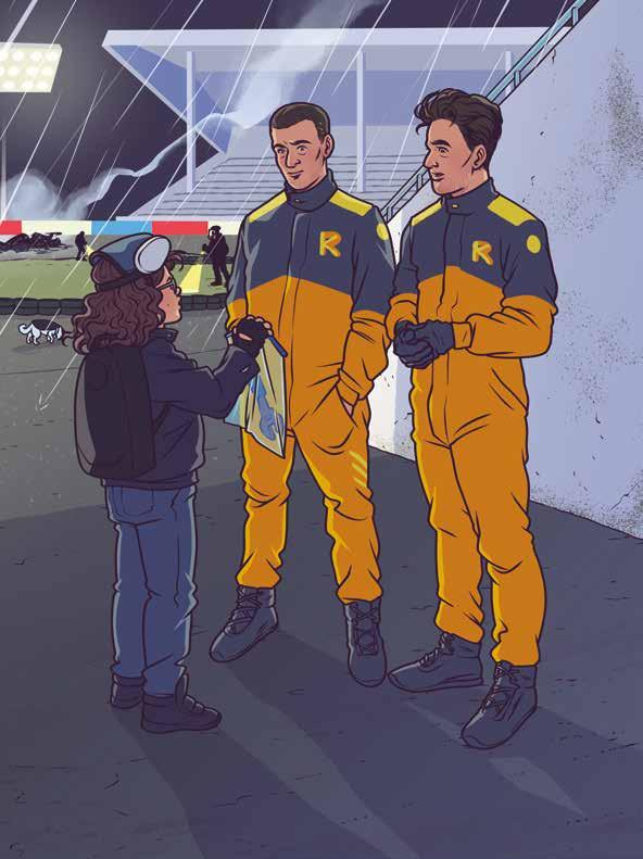 Bröderna Luca och Sandro mötte agenterna vid ingången till banan. De började genast berätta om vad som hade hänt. Om explosionen, om den fina bilen som var sprängd i tusen bitar och om Sandro som inte skulle kunna tävla i Krimsta Grand Race längre. Formel 1-bilar var svåra att få tag på bara sådär, och Sandros var dessutom specialtillverkad.
