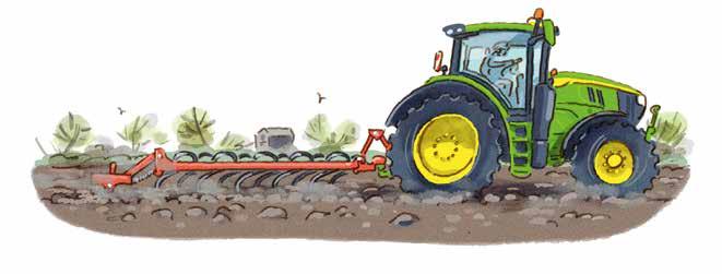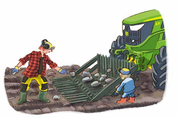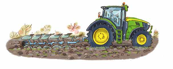 Traktorn drar alla redskap som behövs. På hösten plöjer han åkrarna med plogen. Då vänds jorden upp och ner, så att ogräset hamnar underst. Efter det måste han plocka sten. Allt som är större än en apelsin ska bort. För riktigt stora stenar använder han stengrepen.