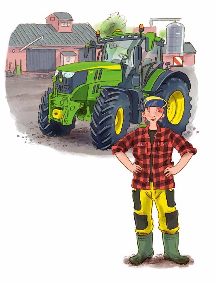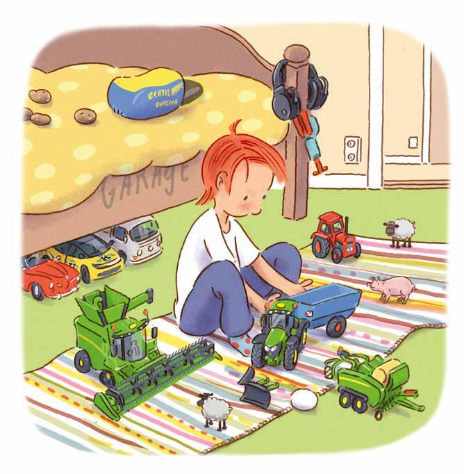 Halvan älskar att leka med sin nya traktor. Den har tre tillbehör: en kärra, en plog och en balpress som pressar ihop hö och halm till balar. Han har också en skördetröska. Både Halvans traktor och skördetröska är gröna. Det är en vanlig färg på jordbruksmaskiner.
