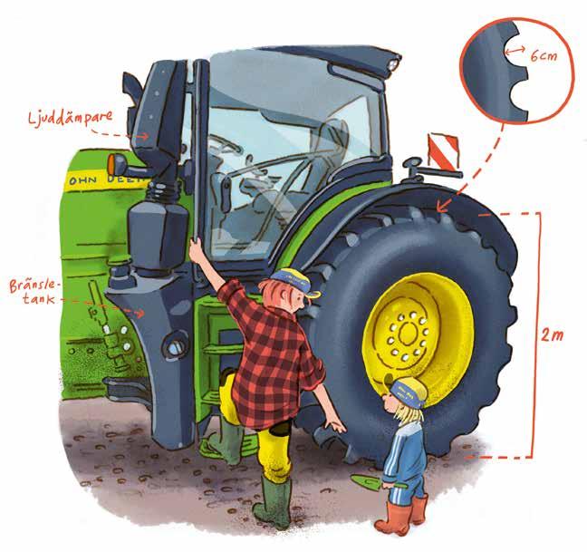Däcken har drygt sex centimeter djupa mönster. Det behövs för att den tunga traktorn ska kunna köra i skogen och på leriga åkrar. De största traktorerna kan ha band i stället för vanliga hjul.