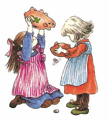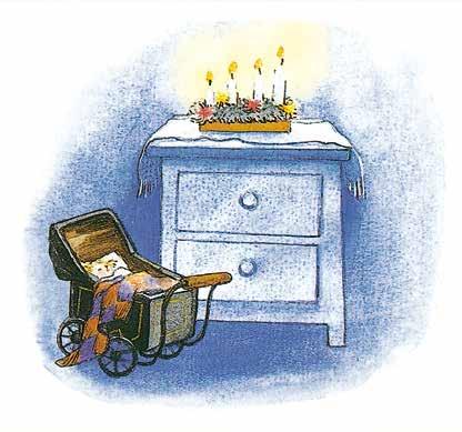 Och de skakar sina spargrisar och hör att det låter som mycket pengar i dem. Av det där skramlet ska det bli julklappar, det är därför det skramlar så trevligt. De har en almanacka på väggen i barnkammaren. Varje morgon rycker de bort ett blad och vet att nu är det en dag närmare jul.