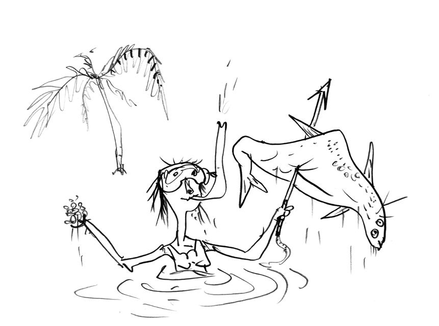 Vattnet bryts bakom mig och Malin dyker upp. Hon tar av sig snorkel och cyklop och visar upp sin fångst. Hon har skjutit en fisk med harpun och