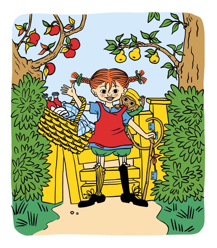 Det tyckte Tommy och Annika var ett bra förslag. Tommy och Annika rusade hem och det dröjde inte länge förrän de var tillbaka. Då stod Pippi redan utanför grinden med Herr Nilsson på axeln, vandringsstav i den ena handen och en stor korg i den andra.