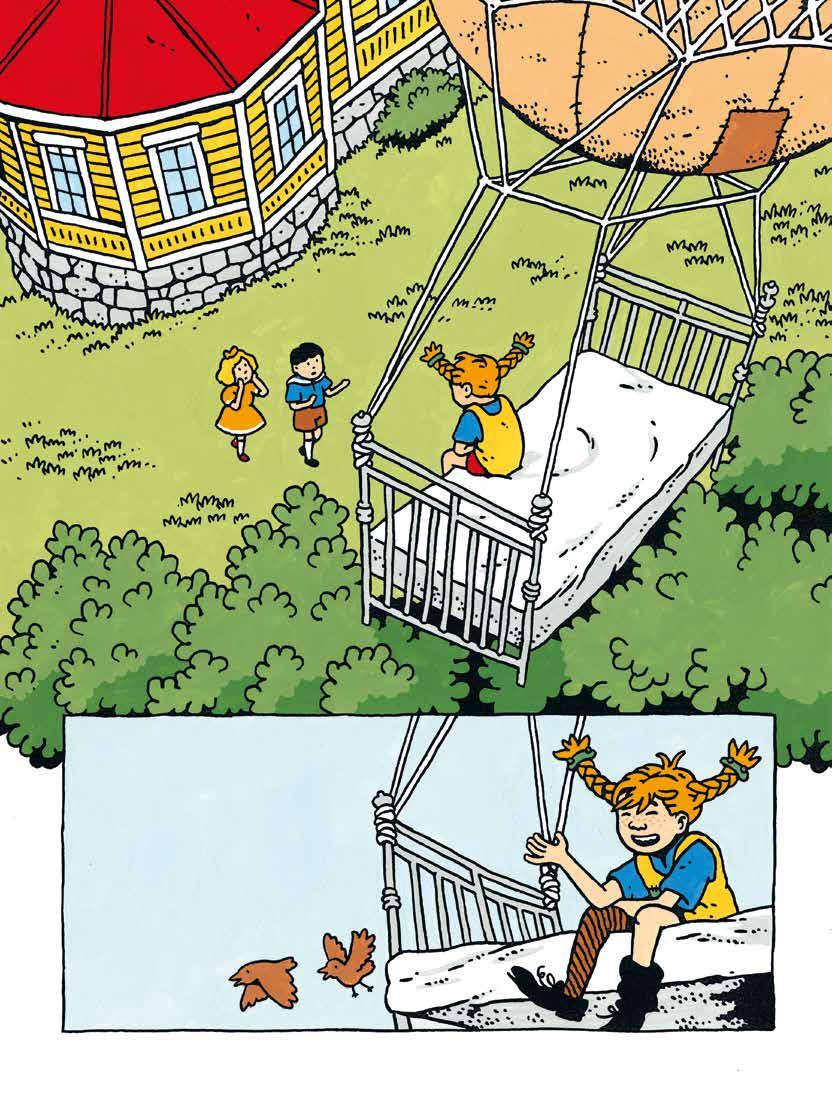 Tommy och Annika sprang ut och stirrade häpna uppåt. I skyn svävade Pippi. Hon satt på en järnsäng som var fastsatt under en jättelik ballong.