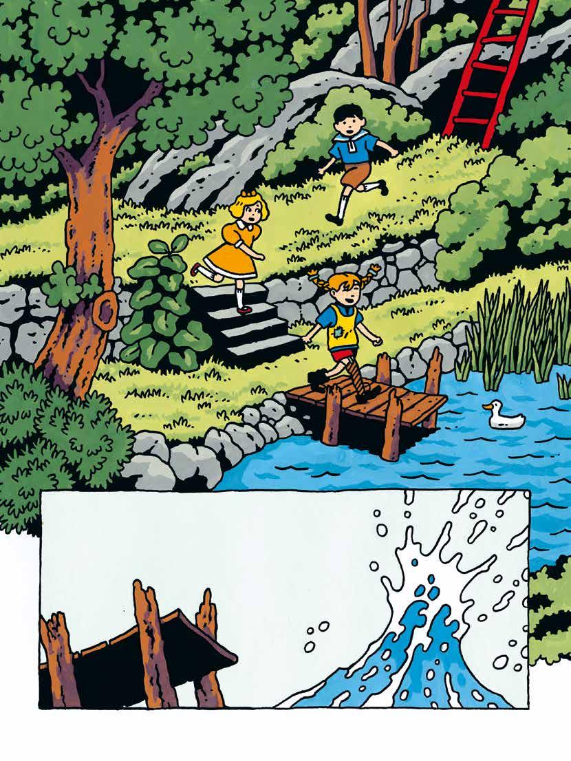 Nästa dag hade Pippi bestämt sej för att hon skulle försöka gå på vattnet. Med taktfasta steg gick hon ner till bryggan och Tommy och Annika följde efter.