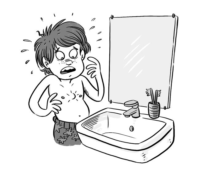Jag vaknade av att det kliade. Bröstkorgen kändes öm och svullen när jag klev upp ur sängen. Lägenheten var tyst och mörk, dörren till mammas sovrum stängd. Jag tassade förbi, ville inte störa henne om hon sov. Istället gick jag in i badrummet och drog av mig pyjamaströjan.