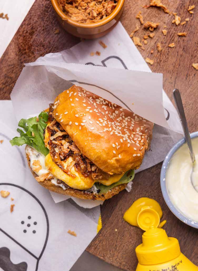 6. LĂ€gg majonnĂ€s pĂ„ brödet, salladsbladet och sedan hamburgaren med osten. Toppa med karamelliserad lök och lite rostad lök och pĂ„ med locket â klart!