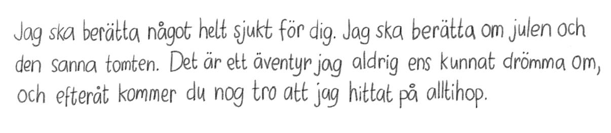 Jag tittade ut på familjen Talvis hus på andra sidan gatan. Dom hade julröda gardiner och det lyste elljusstakar och adventsstjärnor i vartenda fönster. Och på husväggen, alldeles vid balkongen, klättrade en jättestor låtsastomte. Hos familjen Shaba några hus bort blinkade ljusslingor i regnbågens alla färger. Våra fönster däremot, var alldeles mörka och trista.