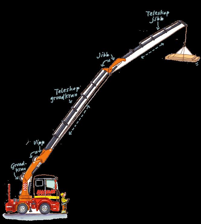 Kranen når 50 meter högt och 48 meter bort. Det är de bilarna du kan se när det byggs hus. Då har de byggdelarna på flaket (eller på en annan lastbil som följer med) och Halvan lyfter dem på plats med hjälp av kranen.