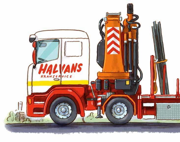 Nu är Halvan själv kranbilsförare. På jobbet har han arbetsbyxor och en jacka med företagets märke på bröstet. När han lämnar förarhytten har han nästan alltid hjälm på sig. Och skor med stålhätta. För att bli kranbilsförare måste man ha ett körkort som visar att man får köra en tung lastbil.