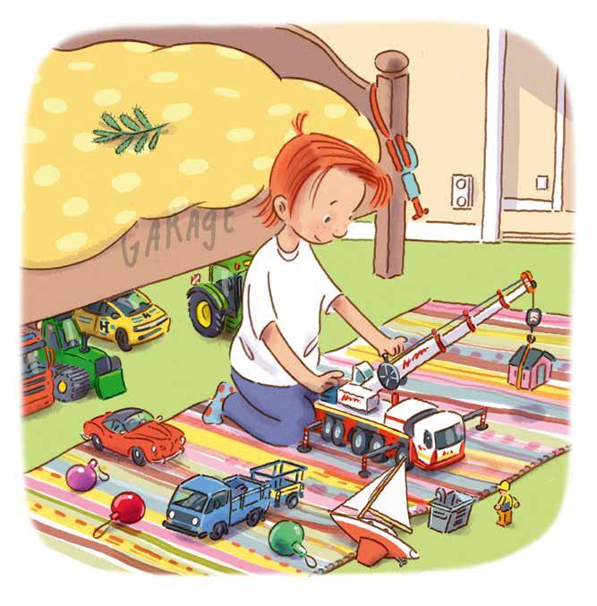 Halvan älskar att leka med sin kranbil. Den ser ut som en riktig: en lastbil med en stor kran som går att fälla upp och vrida. Lyftkroken går att veva upp och ner med en liten ratt. Det finns fyra stödben som han kan fälla ut. Med kranens hjälp kan han lyfta upp saker på sängen. Till kranbilen hör också en korg som han kan sätta en legofigur i.