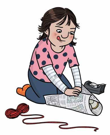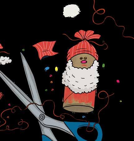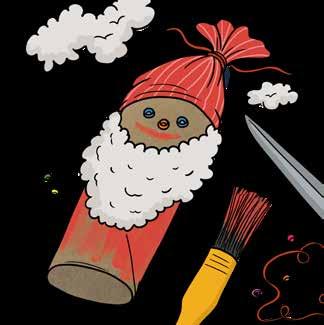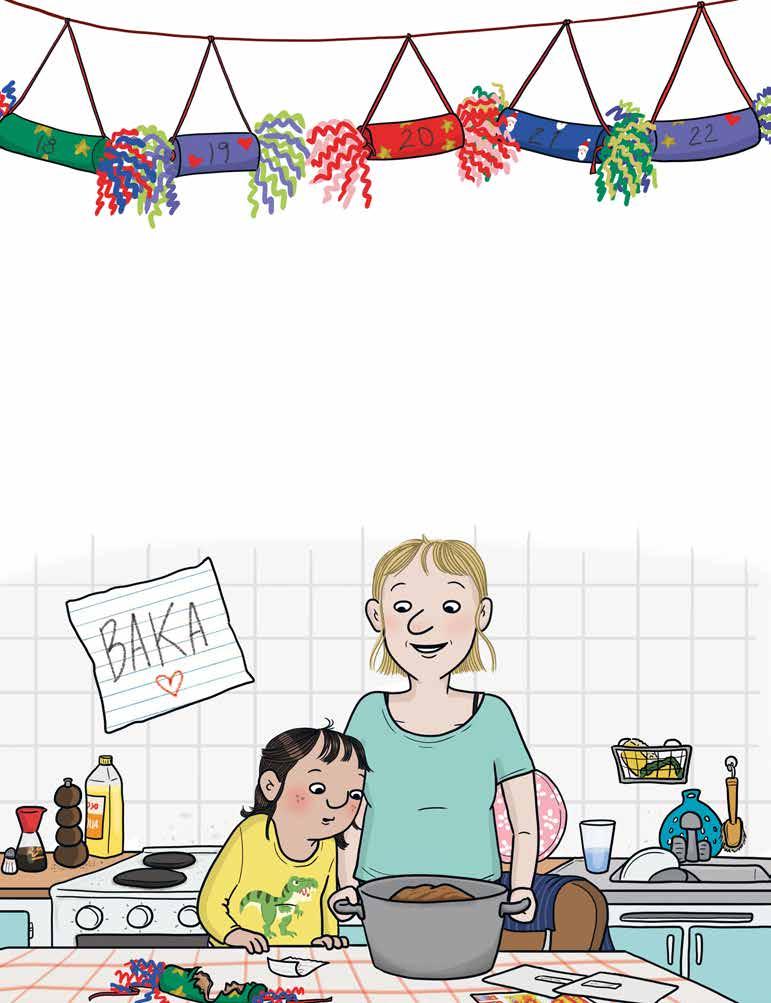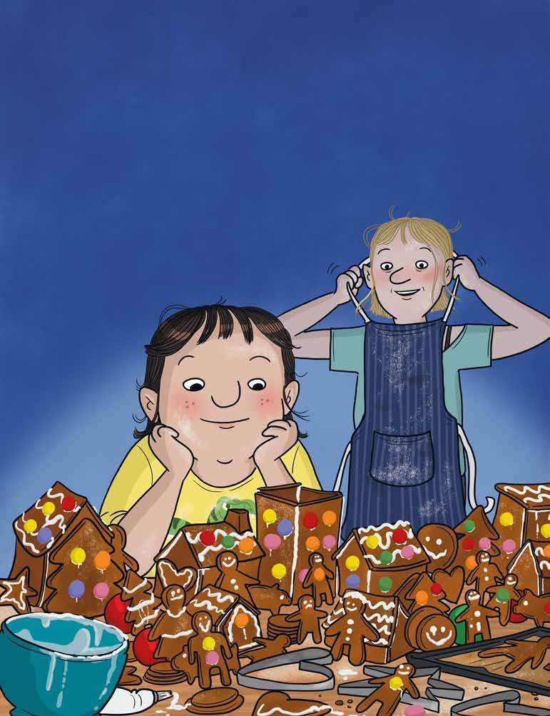 Sam har ett helt förråd fullt med paket, och Sixten får en ny leksak varje dag i sin legokalender. Jag har bara en kalender av smällkarameller. Mamma säger att det är en lek-kalender för i varje smällkaramell ligger en lapp med en ny lek. En av lekarna är att baka pepparkakor. Vi bakar så många att det blir en hel pepparkaksvärld! Med toarullar gör vi sen tomtar med bomullsskägg och pärlögon. Tomtarna gör sina egna julklappar, säger mamma. I sin tomteverkstad.