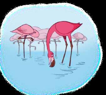 Fräsigare fågel än flamingon är svårt att hitta! Jag hade också velat ha rosa fjädrar över hela kroppen, det är så himla fint! Fast när flamingor föds är de faktiskt ljusgrå, de blir rosa först senare genom maten de äter. Flamingons mat innehåller två ämnen som heter alfa- och betakaroten. Konstiga ord, men det är de ämnena som färgar flamingon. Om vi äter morot får vi också i oss de ämnena. Vi blir tyvärr inte rosa av det, men vi kan faktiskt bli lite gula om vi äter jättemycket morötter!