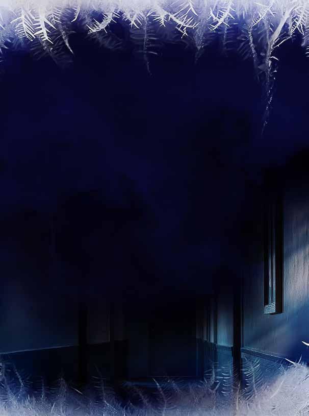 Han går fram till ett av de höga fönstren medan han försöker undvika att få in snö i skorna. Han kikar in, men det är becksvart därinne.