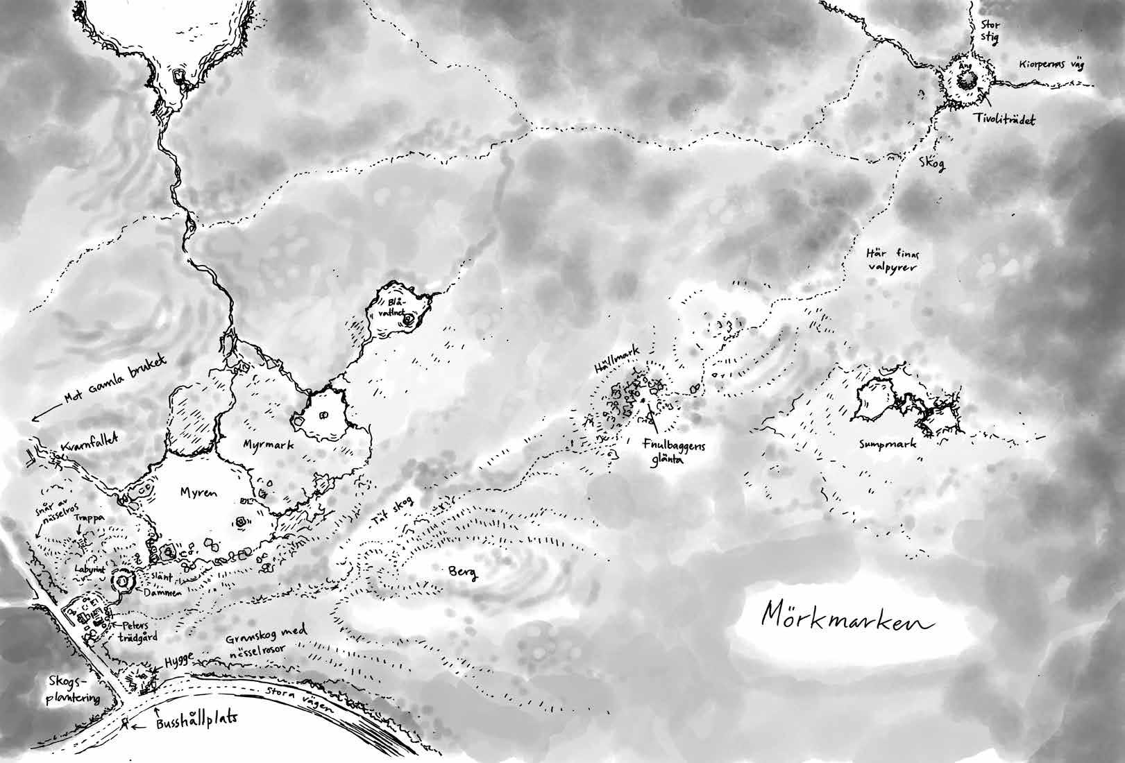 Mörkmarken är en skog. Men det är inte en sån där vacker skog man vill gå in i. Tvärtom. När man tittar på den tänker man att det enda som finns i den är saker som sticks och hål med sumpigt vatten. Ingen går in i den frivilligt.