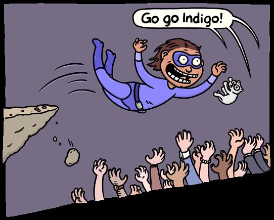 Efter det äventyret bestämde sig Indigo för att lägga av med superhjältandet och gå tillbaka till skolbänken. Hon lämnade över rollen som stans superhjälte till sin nyfunna vän som tog sig namnet Super-Blobly.