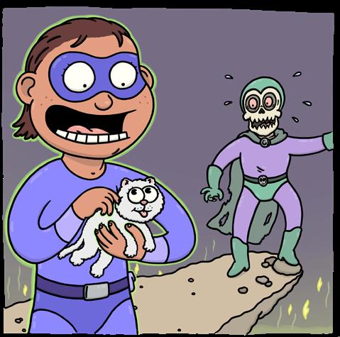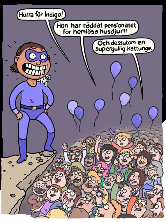 – Du misstar dig, Indigo. Du må ha förstört min plan att spränga pensionatet för hemlösa husdjur, men om du tar ett steg till så släpper jag den här lilla kattungen i vallgraven med radioaktiv lava. – Du menar den här kattungen? säger Indigo och drar handen genom kattungens päls så att den spinner av välbehag. Med hjälp av min supersnabbhet har jag, utan att du ens märkte det, räddat kattungen och bytt ut den mot …