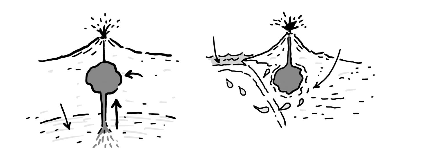 Förvånansvärt nog är gasen i gasig magma faktiskt vatten. Ibland blandas havsvatten med magman och blir till ånga, som är en gas.