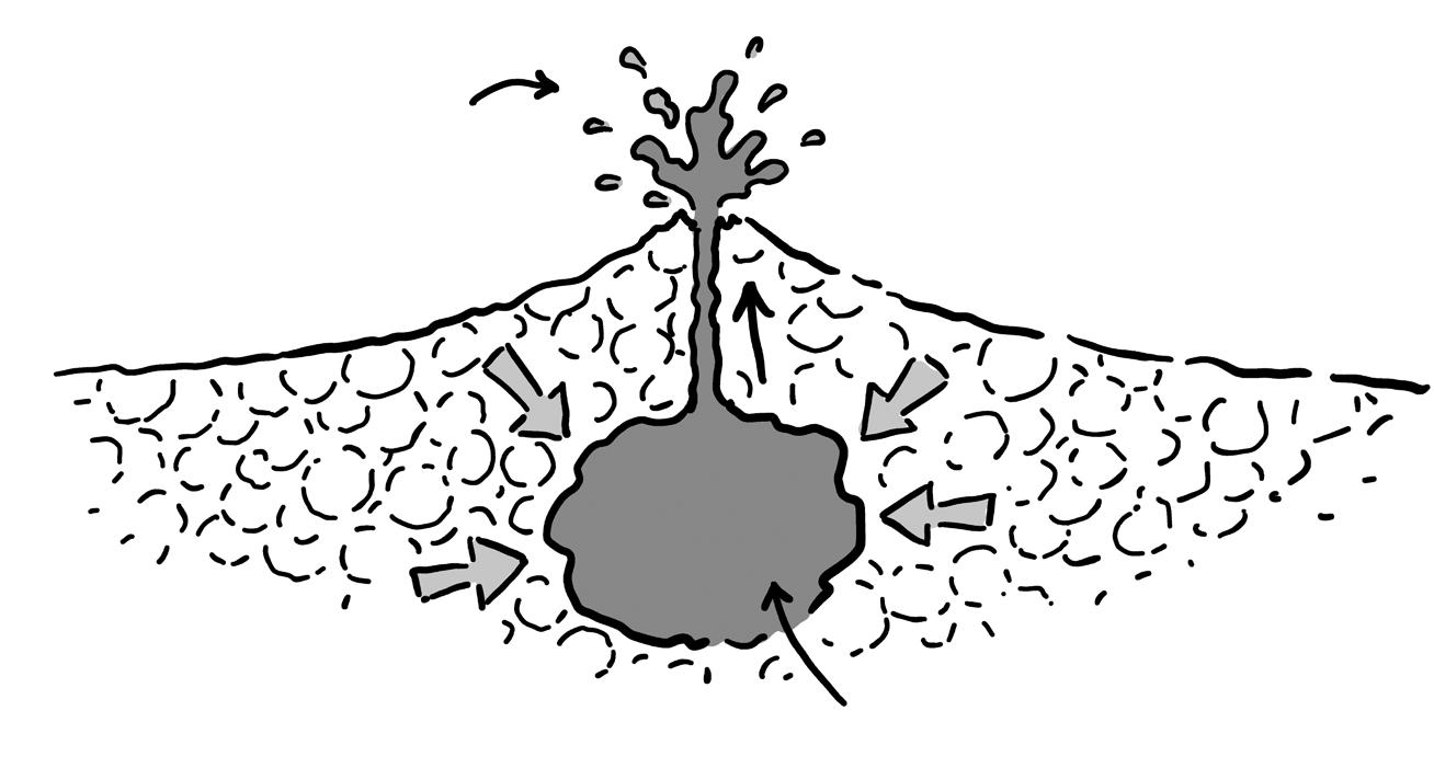 Min faster, vulkanexperten, säger att det uppstår vulkaner när det samlas magma (det vill säga lava innan den kommer ut) i en kammare under marken. Sedan pressas den ihop av allt berg som finns ovanför. Om kammaren trycks ihop tillräckligt mycket rör sig magman uppåt och kommer ut som lava på toppen.