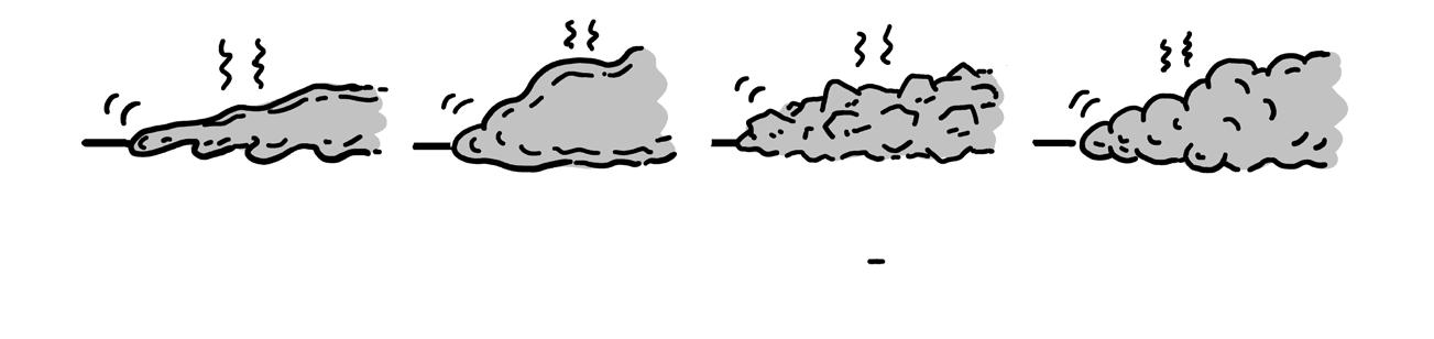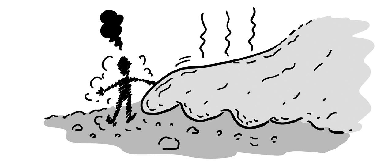 Ibland sprutar en vulkan även ur sig en massa aska, stenar och heta gaser som forsar som en lavin nerför vulkanens sida. Det är hett (700°C) och
