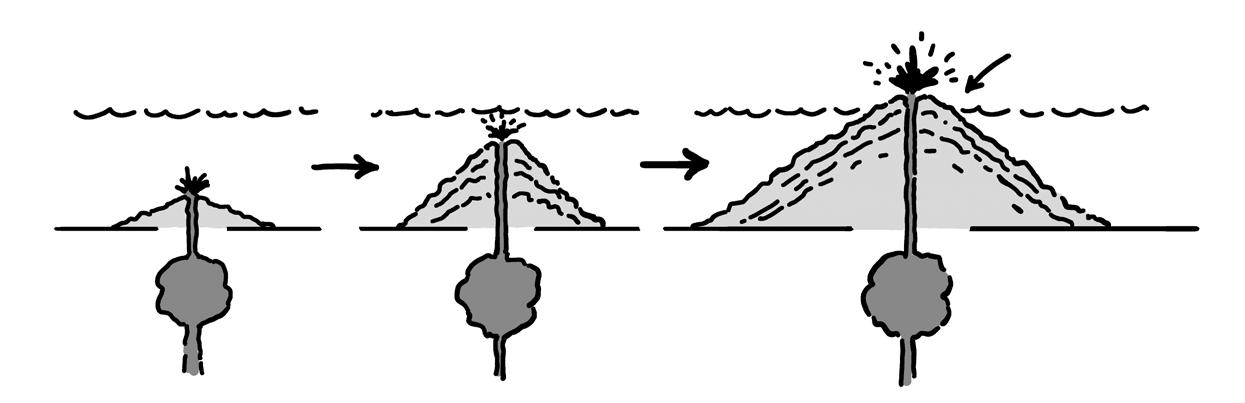 Lavan spyddes ut, kallnade och stelnade. Sedan fylldes det på med mer lava som också kallnade och vulkanen blev större. Så småningom blev vulkanerna så stora att de stack upp ur vattnet och blev öar.