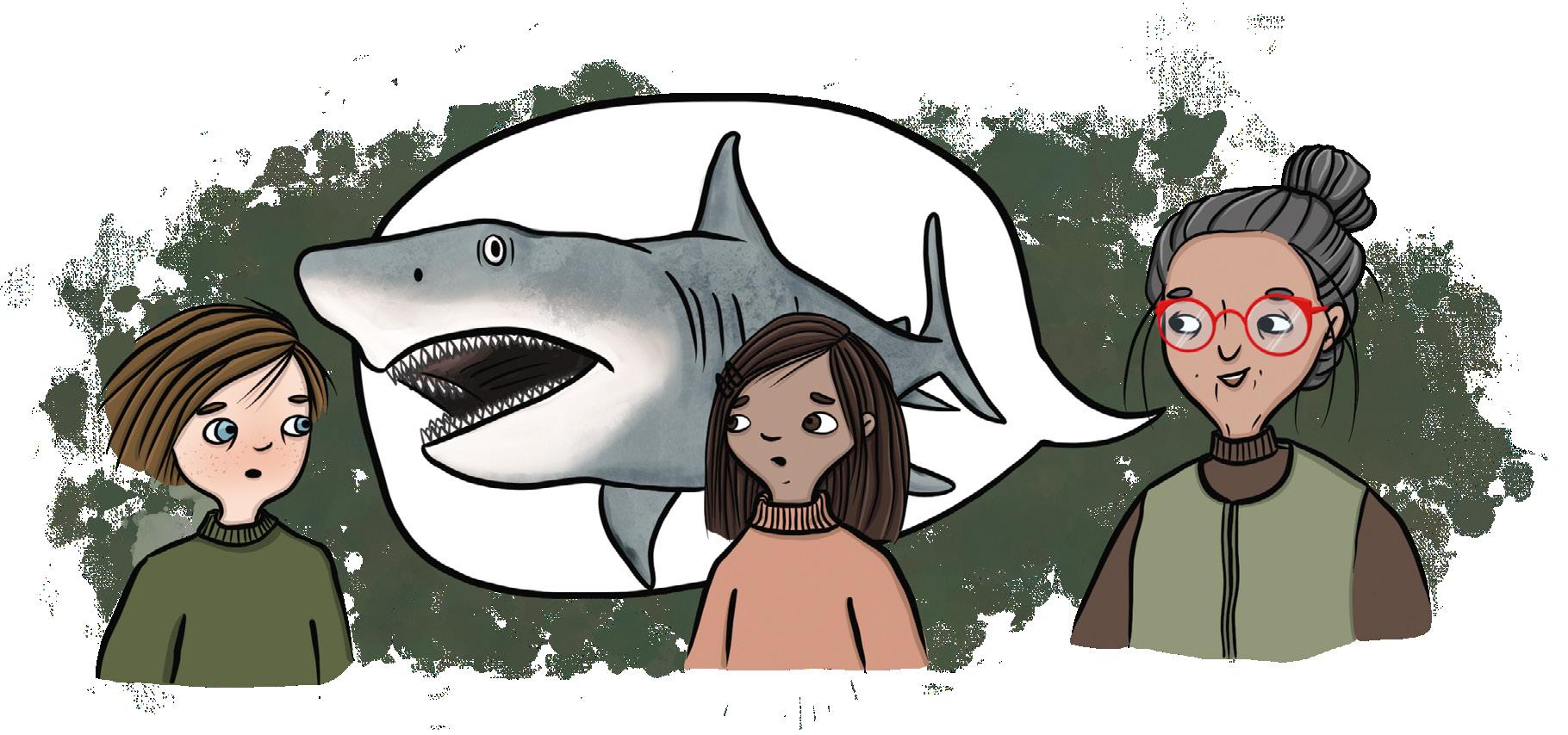 Maria säger att Megalodon var den största hajen. Den var nästan 20 meter lång och vägde 50 ton.