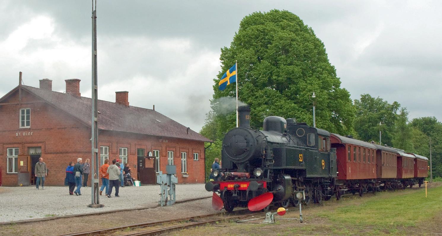 vevar ner vägbommarna för hand. Tåget går inte så fort – max 40 km/h. Men man hinner njuta av utsikten över det skånska landskapet.