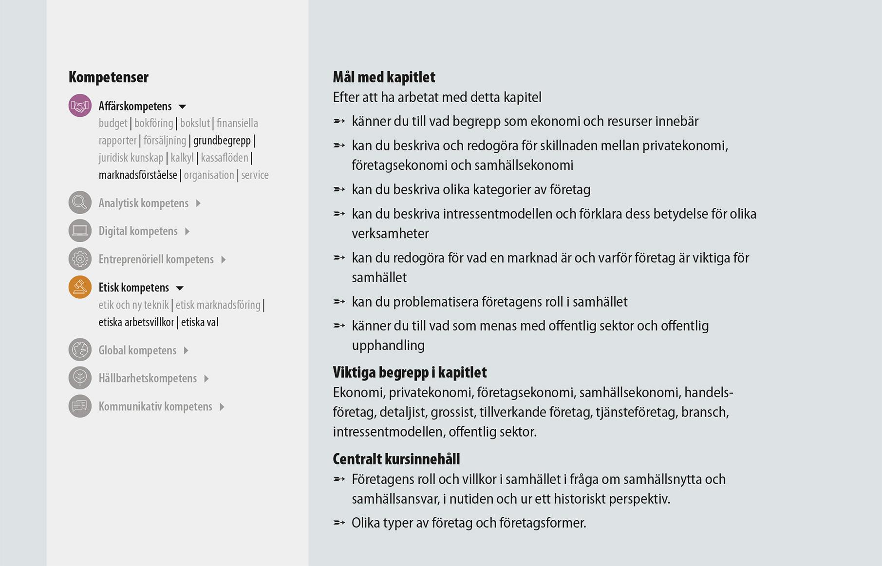 Kompetens är ett helt nyskrivet läromedelspaket för kursen företagsekonomi 1 – skapat idag, för elever som lever i samtiden och blickar mot framtiden! I Kompetens ligger betoningen på att utveckla elevernas förmåga att tillämpa sina kunskaper och färdigheter i företagsekonomi och därigenom utvecklar ett flertal kompetenser.