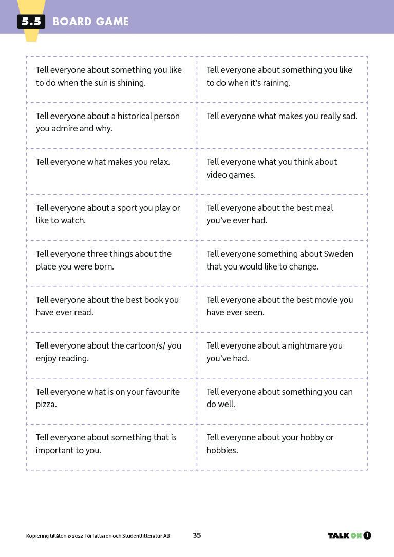 Kopiera det antal uppsättningar kort från 5.5 Board game som du behöver till grupperna. Låt eleverna göra sina egna spelplaner eller använd en spelplan från ett annat spel. Det går med alla typer av spelplaner där man flyttar en spelpjäs.