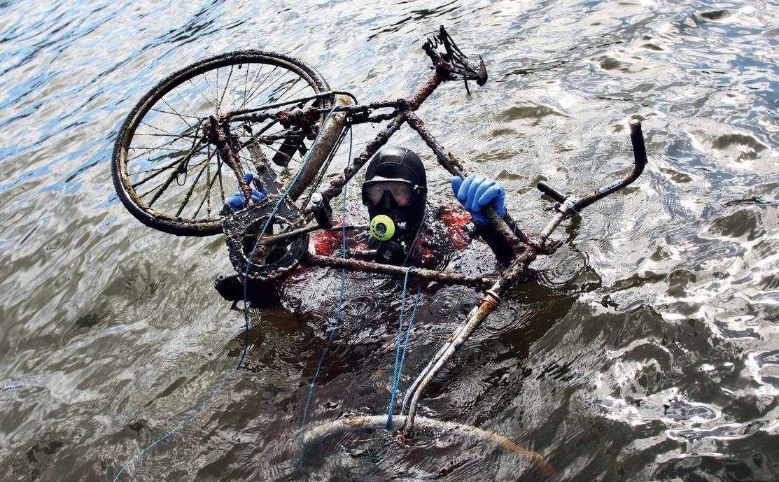 HÀr hjÀlper dykare till att stÀda under vattenytan. PÄ en enda dag kan de plocka upp flera ton skrÀp! Allt lÀmnas till Ätervinningen.